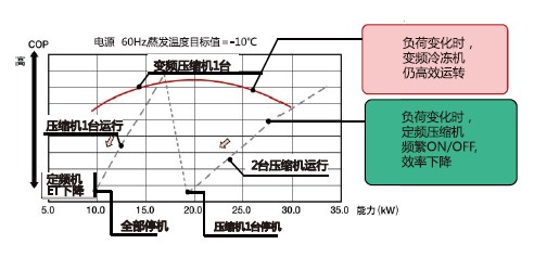 ■與交流變頻對(duì)比,直流變頻冷凍冷藏系統(tǒng)COP更高,更節(jié)能