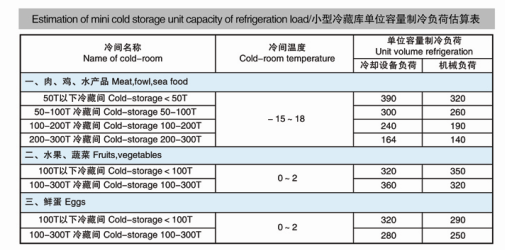 小型冷藏庫單位容量制冷負荷估算表